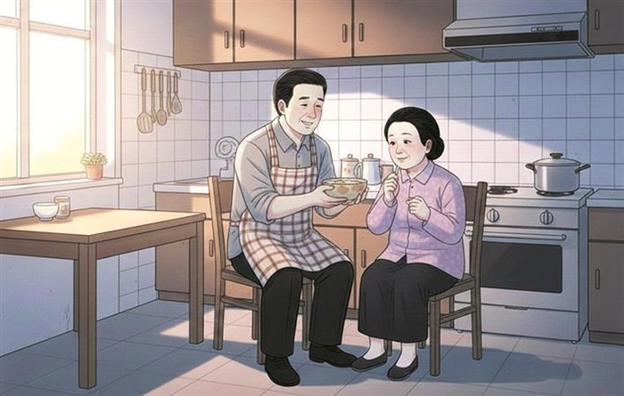 ⑧清晨的厨房里,盛茂宫系着围裙忙碌地准备早餐。随后,又帮妻子洗漱、按摩,即便妻子偶尔发脾气、吐饭,他也始终轻声哄劝,动作细致又轻柔。