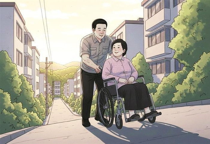 ⑨小区坡道上,盛茂宫弯腰推着轮椅,额头沁满汗水;轮椅上的妻子望着他,笑得像个孩子。“她生病前就爱散步,我不能因她生病就把她关在家里。” 盛茂宫说。
