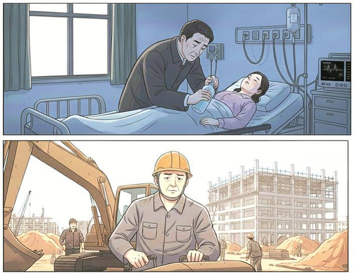 ⑤深夜的病房里,盛茂宫用毛巾裹着冰瓶,轻轻敷在妻子额头;白天的项目工地上,尽管身心俱疲,他依然咬牙坚持。短短数月,鬓角悄然染霜,眼角也刻上了抹不去的沧桑,可他从未有过一丝退却。